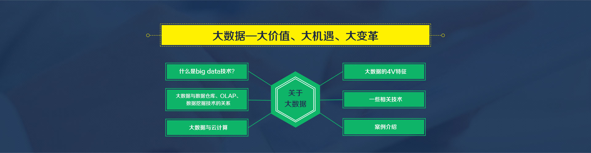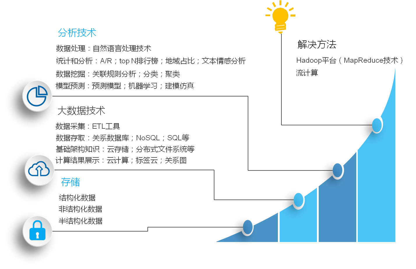大数据技术涵盖从数据的海量存储、处理到应用多方面的技术,包括海量分布式文件系统、并行计算框架、NoSQL数据库、实时流数据处理。