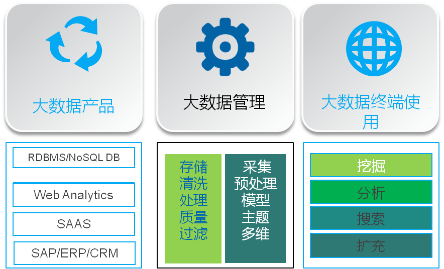 云计算方式下,用户业务迁移到云端之后,必定带来海量数据的产生,需要着眼未来解决大数据需求。云计算更偏重海量存储和计算,以及提供的云服务,运行云应用,但是缺乏盘活数据资产的能力。挖掘价值性信息和预测性分析,为国家、企业、个人提供决策和服务,是大数据核心议题,也是云计算的最终方向。